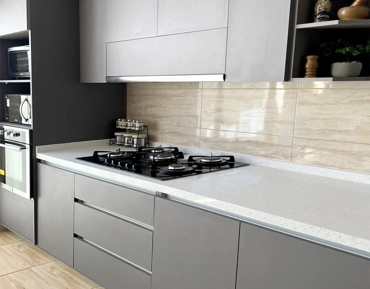 Proyecto de mobiliario a medida en el cual se fabricó una Logia funcional, Muebles de Cocina, Modular TV, Respaldo de Cama y Veladores Iluminados. Un lindo proyecto desarrollado por nuestro equipo de proyectos especiales.