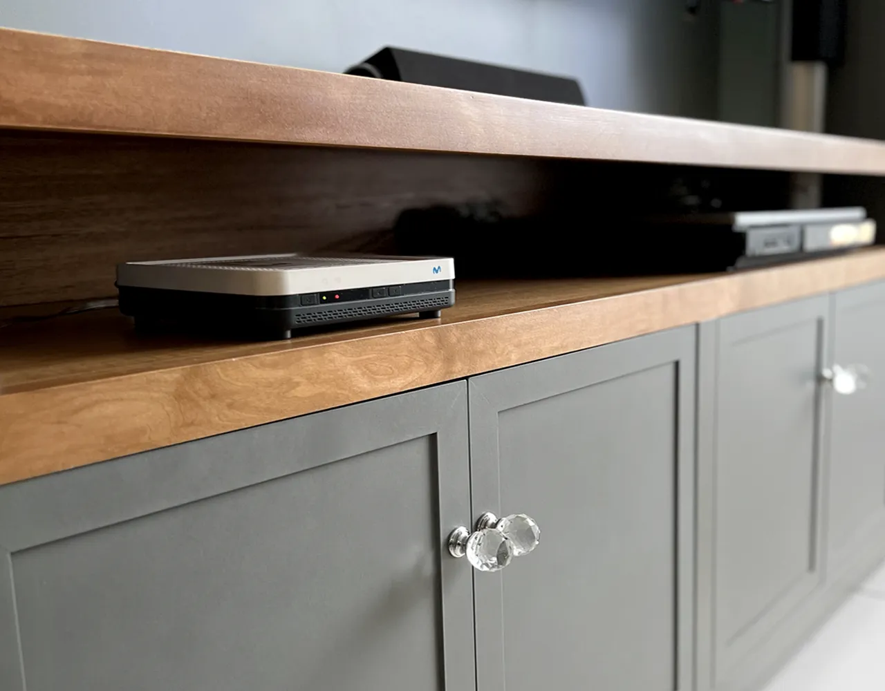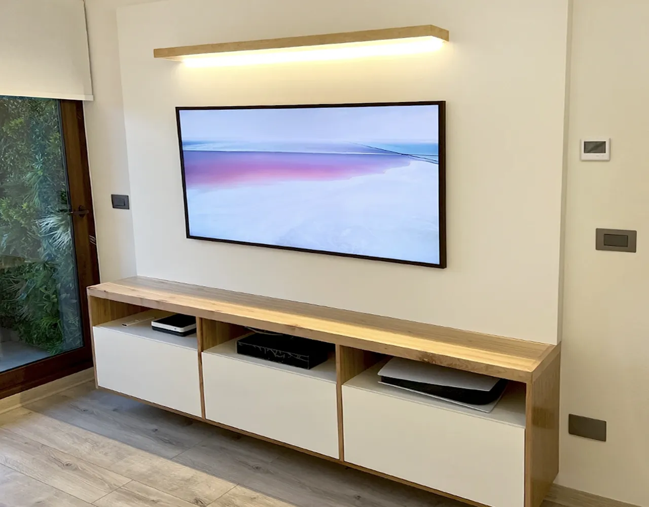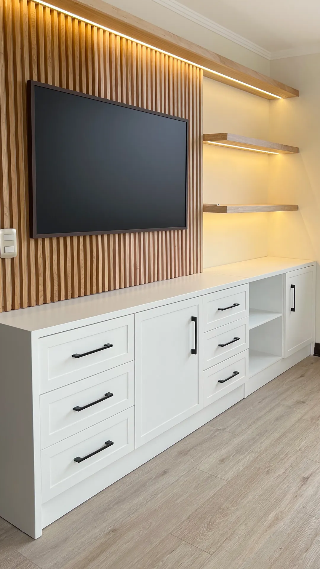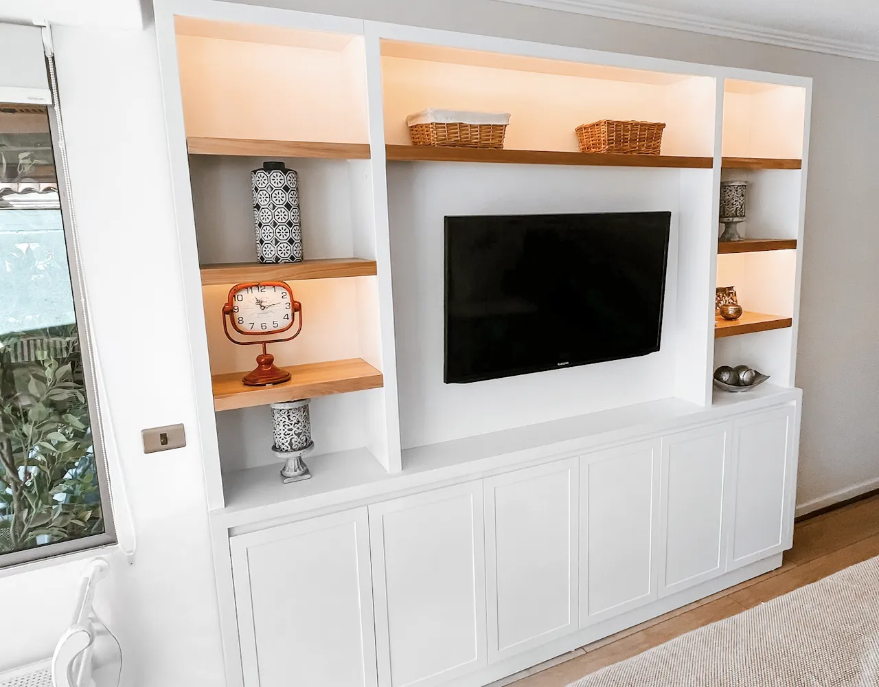Modular TV diseñado y fabricado totalmente a medida, con terminación de lacado, repisas movibles iluminadas, puertas estilo shaker con tirador incorporado y bisagras de cierre suave. ¡Un proyecto muy entretenido de realizar!