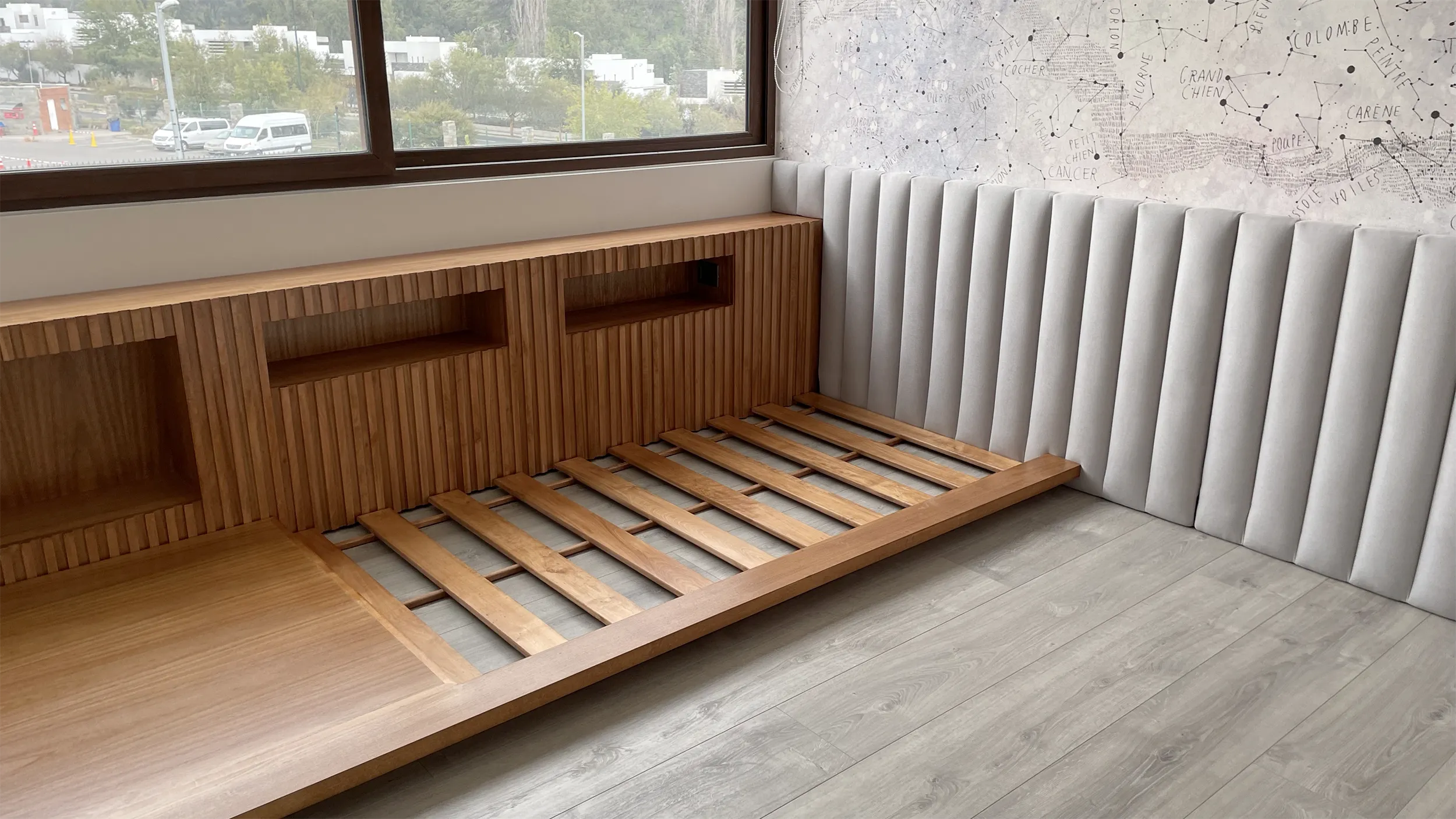 Para el proyecto Krauss se diseñó un dormitorio estilo japonés, fabricado en madera nativa de lenga. Se complementó con unas repisas tipo corchete, un respaldo tubular a muro y un palillaje. ¡Precioso!