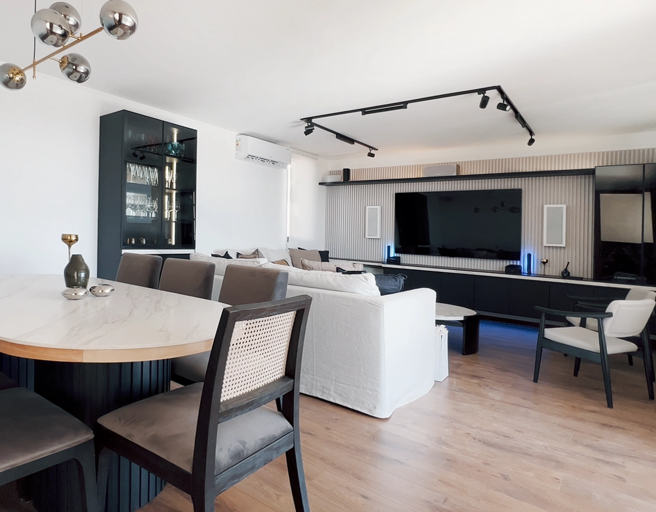 En este proyecto instalamos un Rack TV Flotante iluminado para la sala de entretención y un Rack con terminación de palillaje. Todo el mobiliario es diseñado y fabricado a medida, co-creado con nuestra clienta Catalina.