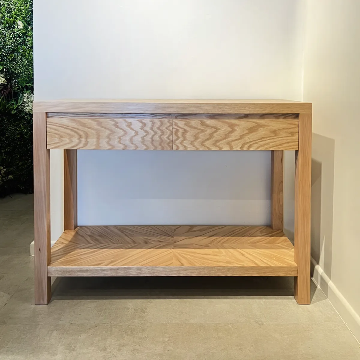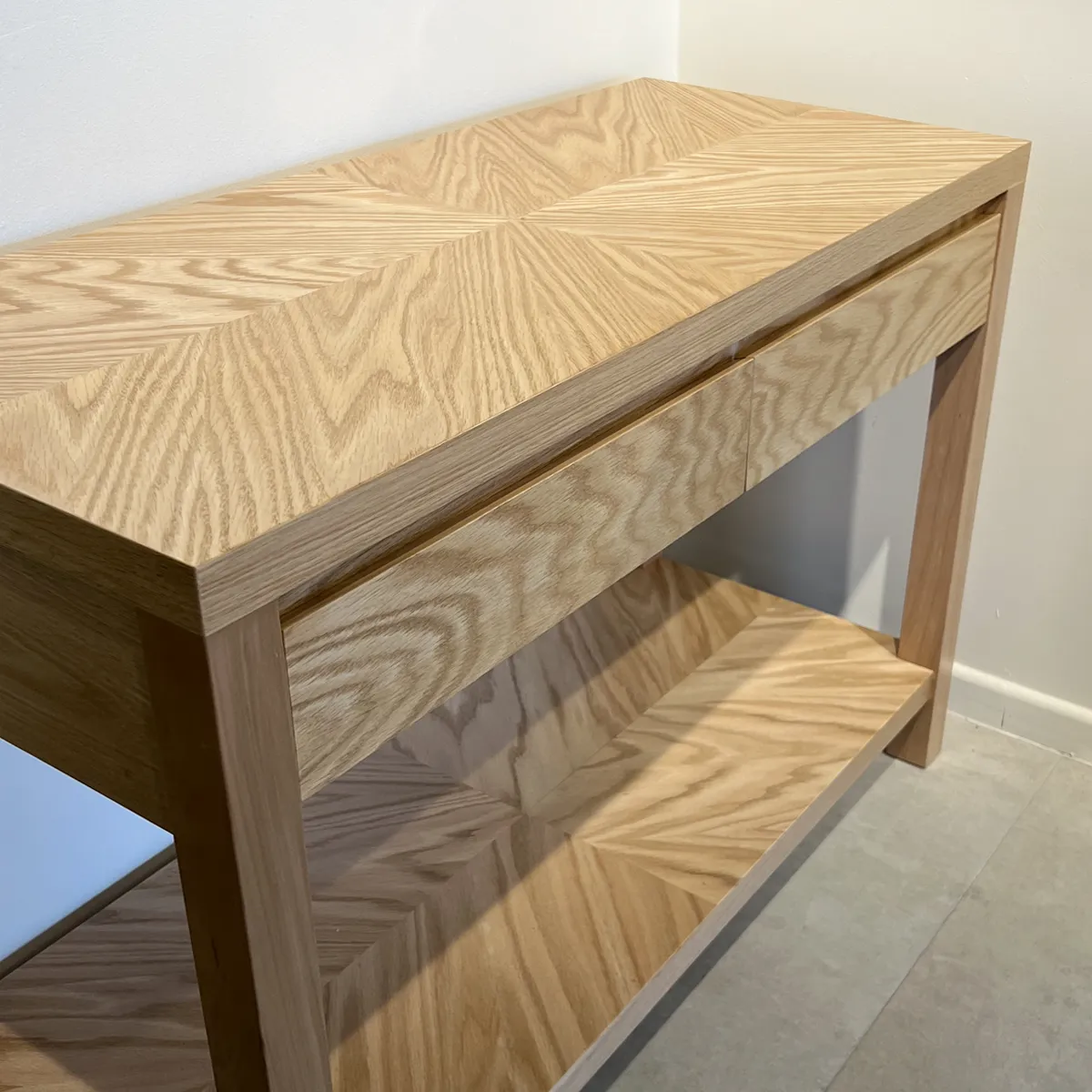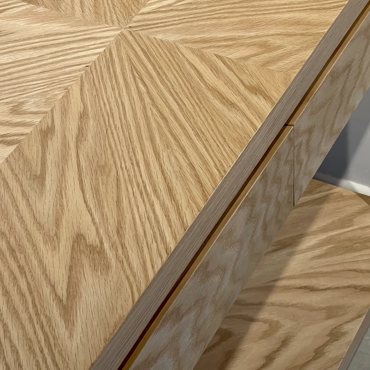El Arrimo Meliá es un producto exclusivo de Espacio Hogar, fabricado con enchape de madera natural de encina, revestido con madera nativa de lenga. Terminación barniz natural. Posee dos cajones y una repisa en la parte inferior. Diseño plumeado hacia el centro en cubierta.