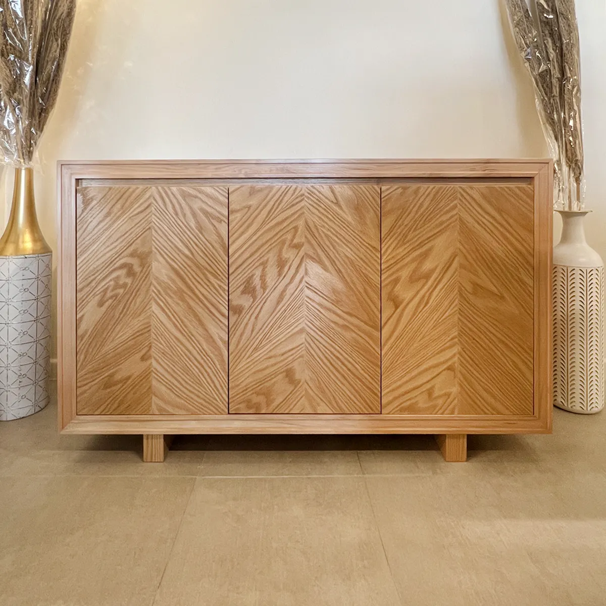 El Buffet Meliá es un producto exclusivo de Espacio Hogar, fabricado con enchape de madera natural de encina, revestido con madera nativa de lenga. Terminación barniz natural. Posee un marco frontal perimetral de madera nativa de lenga de 4.5 cm, tres puertas con repisas interiores y bisagras de cierre suave. Diseño plumeado hacia arriba en puertas y en cubierta al centro.