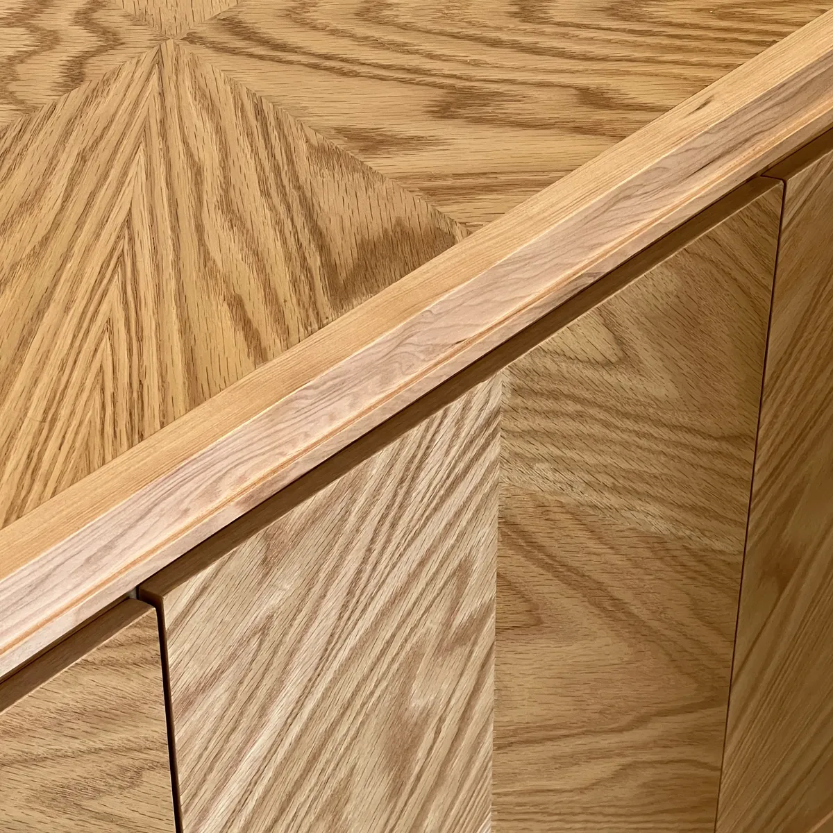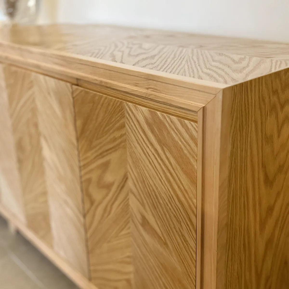 El Buffet Meliá destaca por su diseño cálido y natural, ideal para quienes buscan dar personalidad y estilo a sus espacios. La combinación plumeada de la madera encina con el barniz color natural aporta un contraste elegante y actual que transforma cualquier ambiente. Con una estructura funcional, limpia el Buffet Meliá es perfecto para organizar vajilla, accesorios o elementos decorativos, manteniendo siempre el orden sin renunciar al diseño.