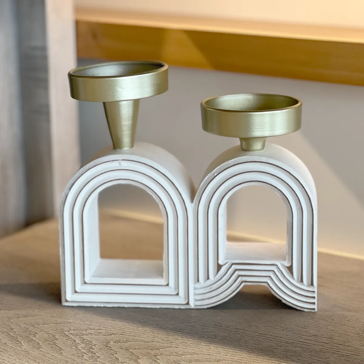 Este candelabro decorativo de diseño geométrico destaca por sus elegantes formas en arco y su estética moderna y minimalista. Su estructura en tono blanco mate, combinada con portavelas metálicos en acabado dorado suave, crea un contraste sofisticado que aporta calidez y estilo a cualquier espacio.