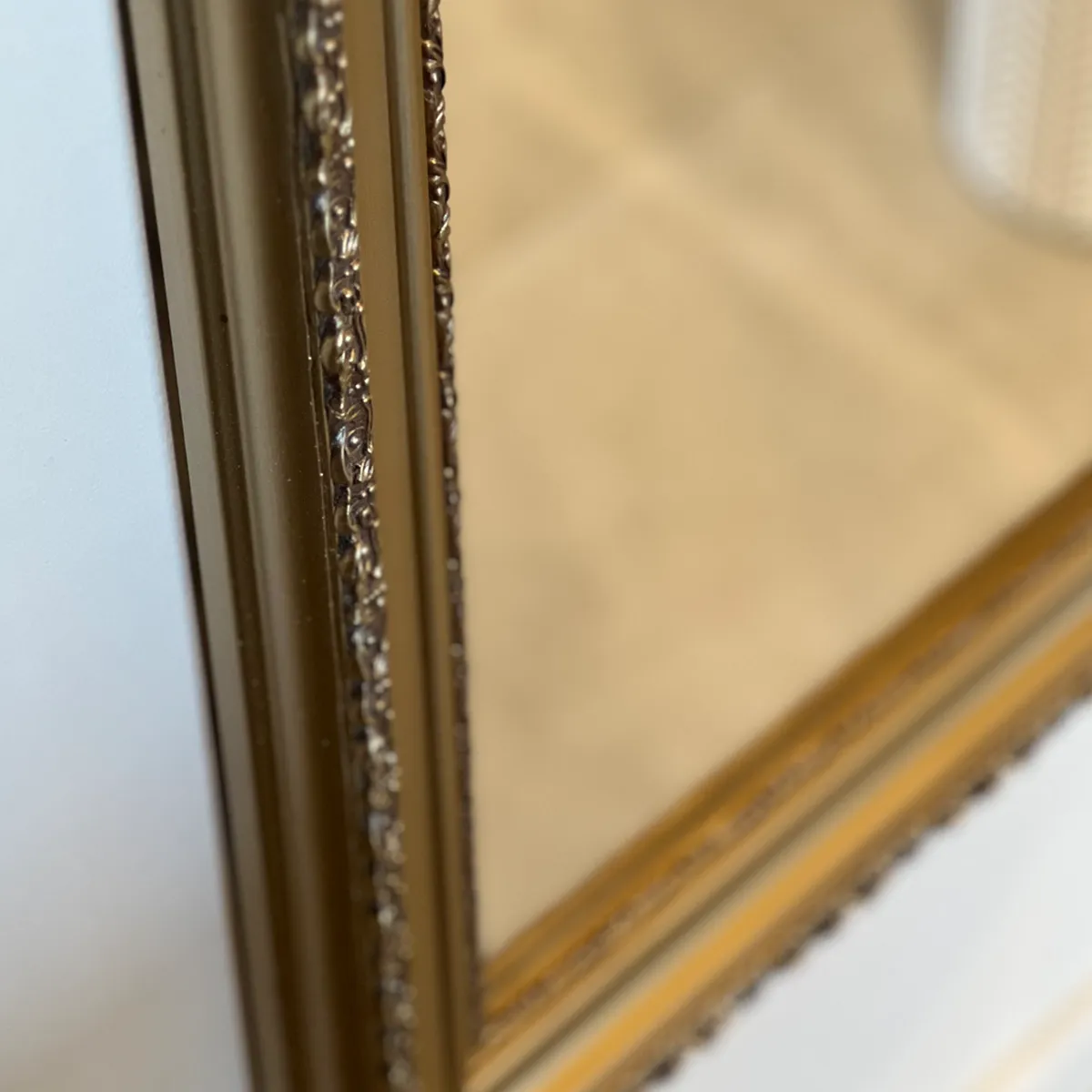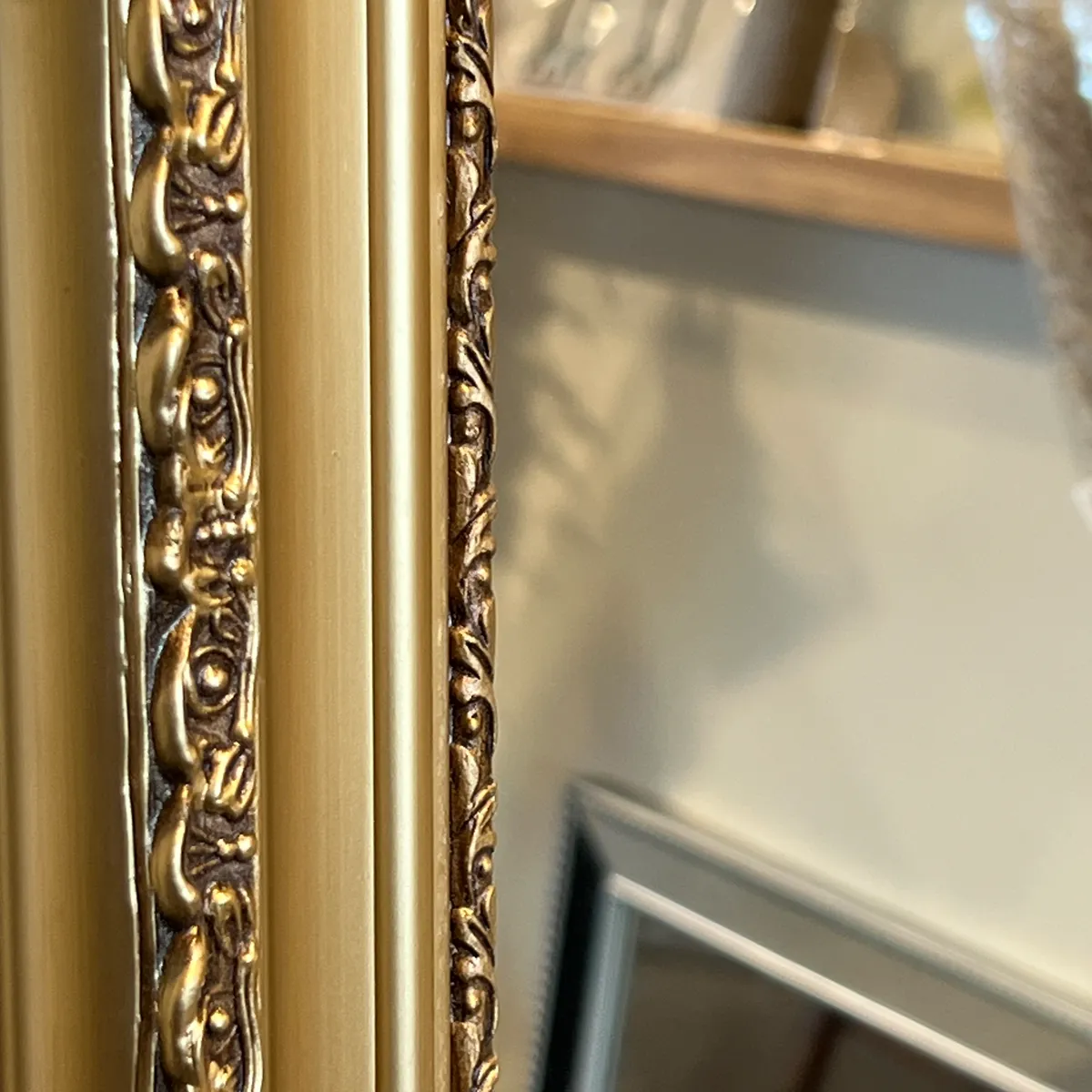 – La moldura del espejo es de madera, terminación ornamental dorado.