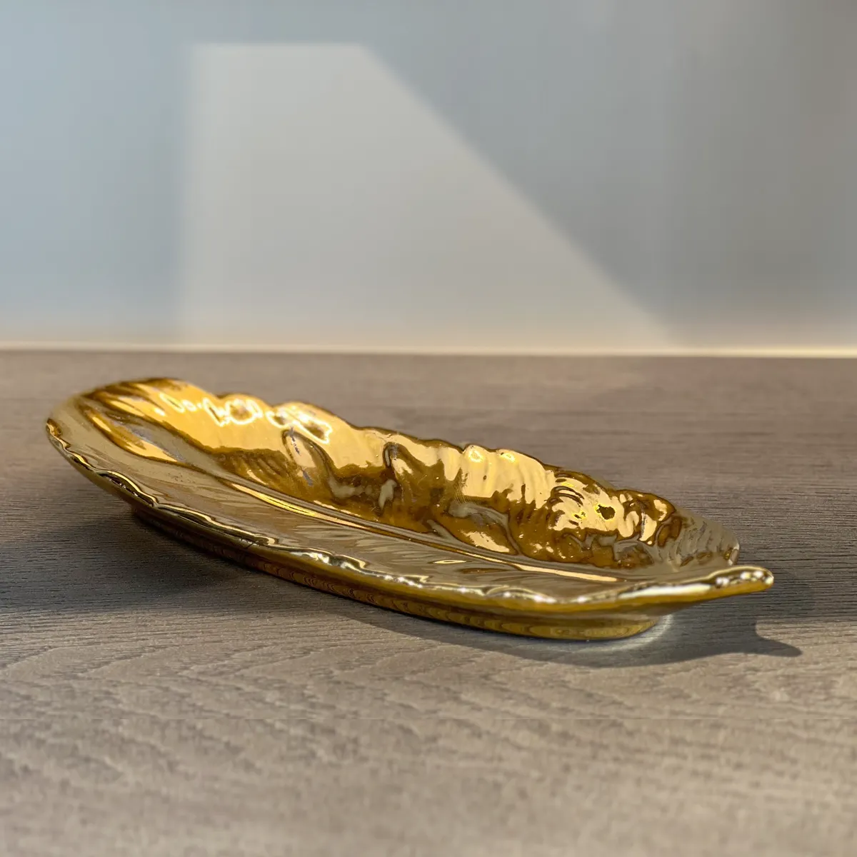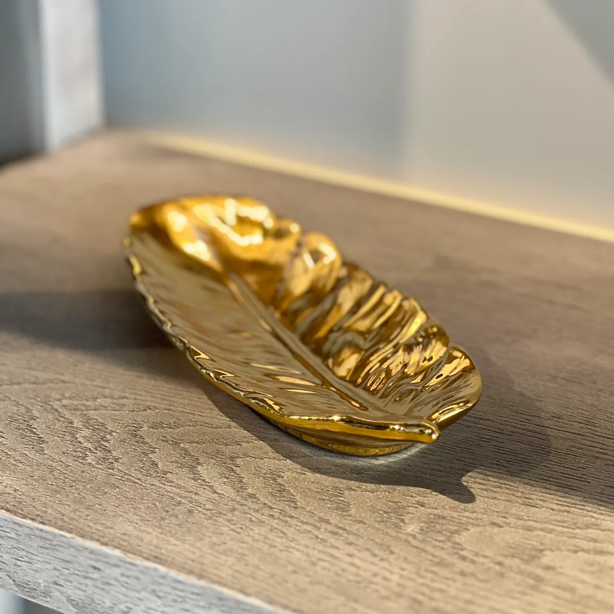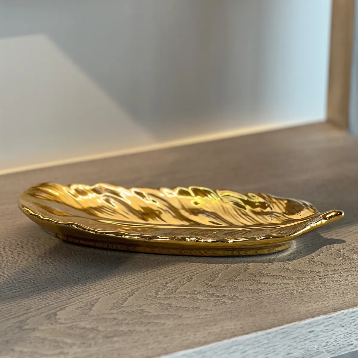 Esta bandeja decorativa con diseño de hoja es una pieza sofisticada que aporta brillo y distinción a cualquier espacio. Su acabado dorado metálico resalta las delicadas vetas y relieves, creando un efecto visual refinado y llamativo. Inspirada en la naturaleza, combina elegancia y calidez en un solo objeto.