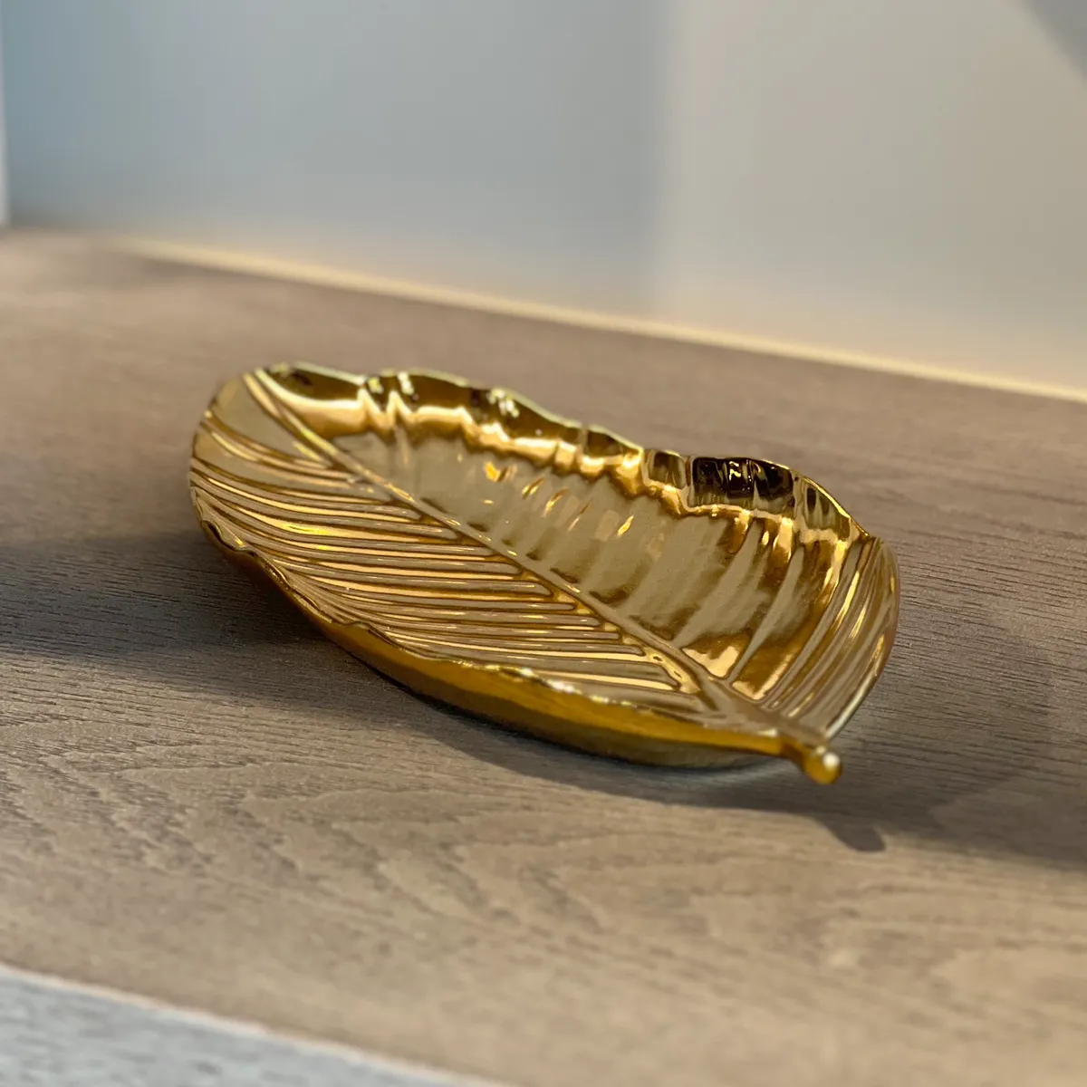 Esta bandeja decorativa con diseño de hoja es una pieza sofisticada que aporta brillo y distinción a cualquier espacio. Su acabado dorado metálico resalta las delicadas vetas y relieves, creando un efecto visual refinado y llamativo. Inspirada en la naturaleza, combina elegancia y calidez en un solo objeto.