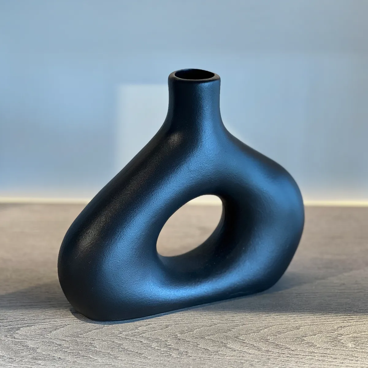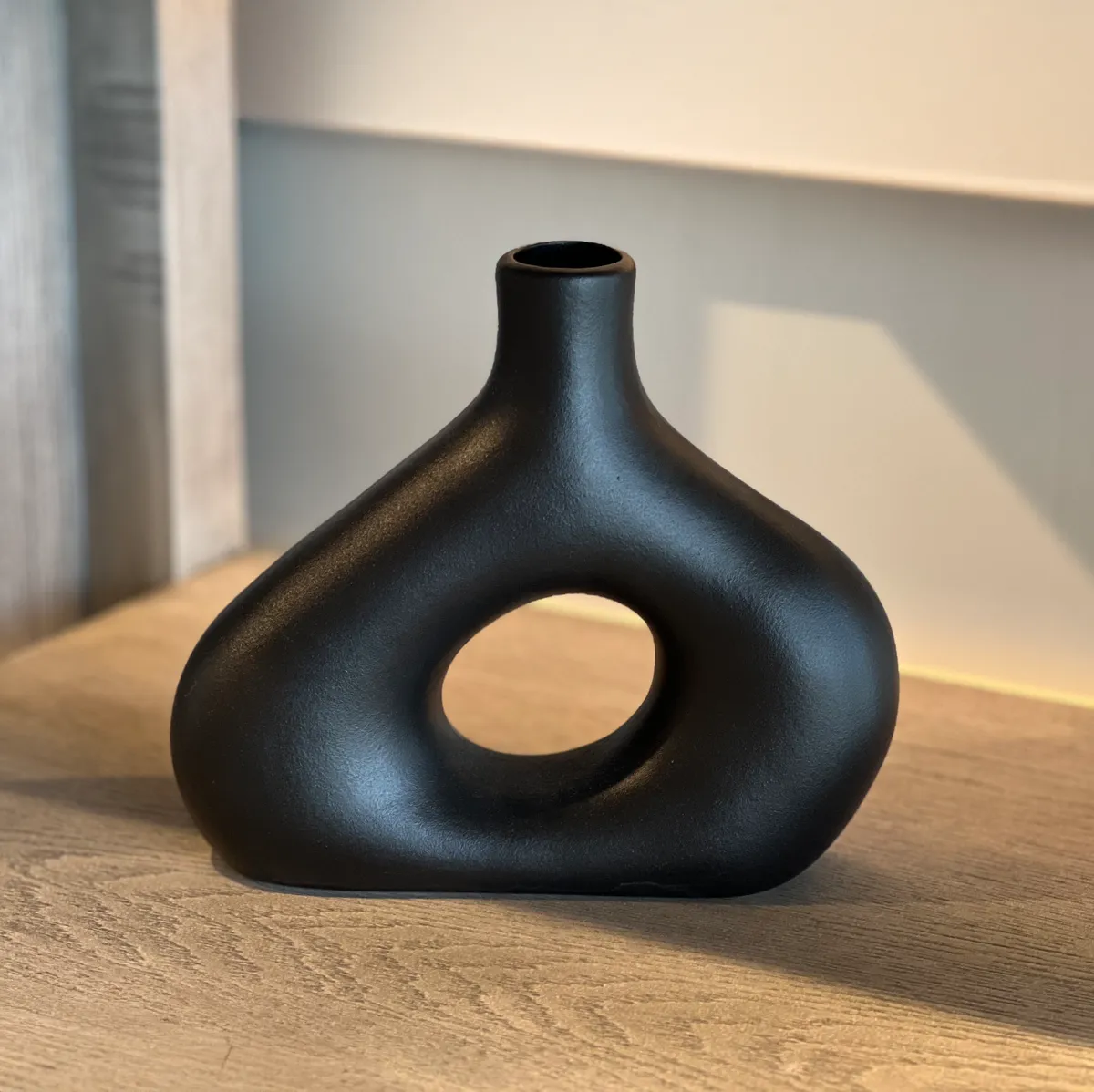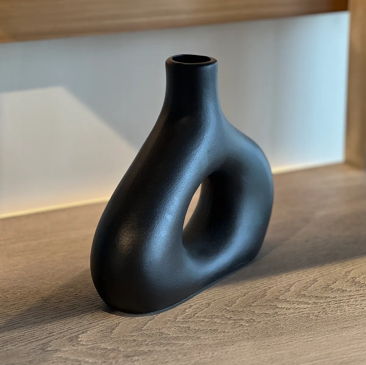 Jarrón Grace de diseño contemporáneo destaca por su forma orgánica y su silueta fluida, que aporta movimiento y sofisticación al espacio. Su acabado mate en tono oscuro realza su carácter moderno y elegante, convirtiéndolo en una pieza escultórica que atrae la mirada desde cualquier ángulo.
