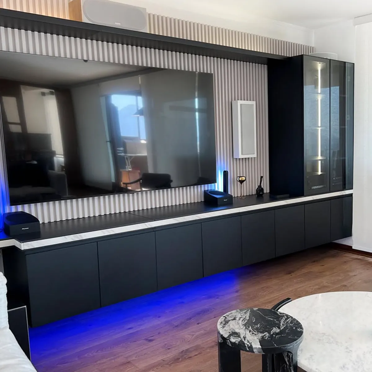 El panel del modular esta hecho en base a un palillaje en tablero de mdf línea 600, terminación lacado blanco. En la parte inferior cuenta con un mueble basal flotante de 8 puertas, con vitrina integrada e iluminación led, el mueble posee un ribete de piedra sinterizada. Además de una repisa voladiza en la parte superior.