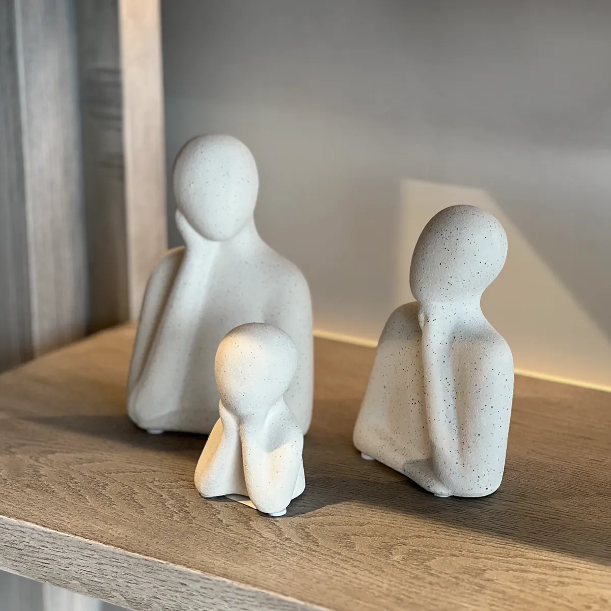 Esta figura decorativa de diseño minimalista transmite calma, introspección y equilibrio. Su forma humana estilizada en posición pensante invita a la reflexión, convirtiéndola en una pieza con fuerte carga emocional y estética. El acabado en tono neutro con textura suave aporta elegancia y naturalidad, integrándose fácilmente en distintos estilos de decoración.