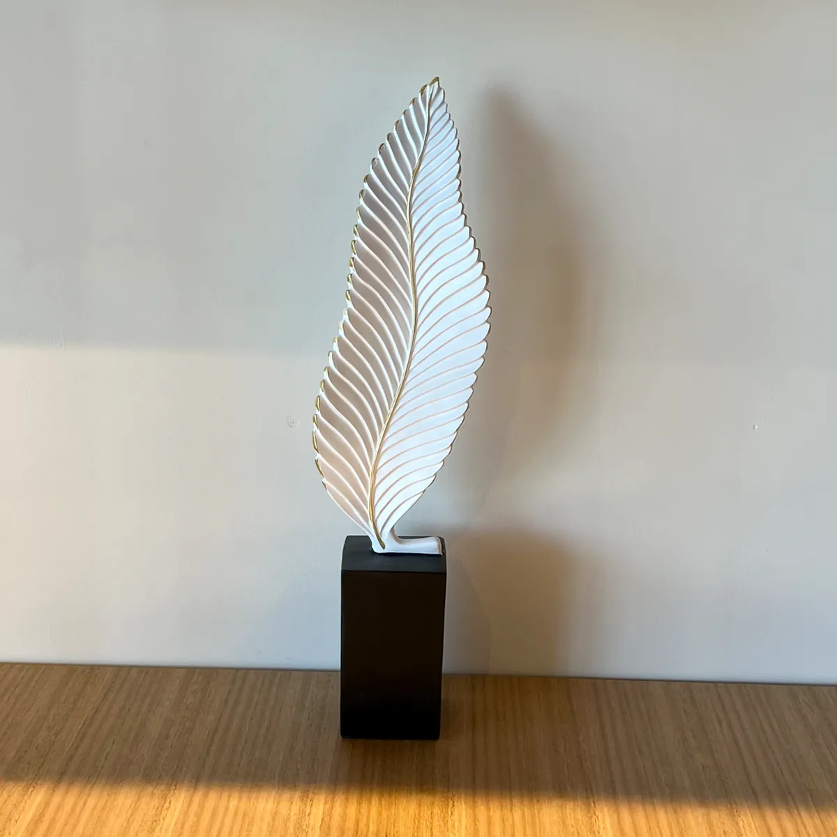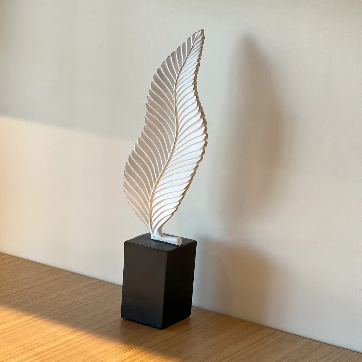 Aporta un toque de sofisticación y estilo a cualquier espacio con esta elegante escultura decorativa en forma de pluma. Su acabado en tono blanco refleja la luz con sutileza, creando un efecto visual cálido y refinado. Está montada sobre una base rectangular negra, que aporta estabilidad y un contraste moderno que realza su diseño.