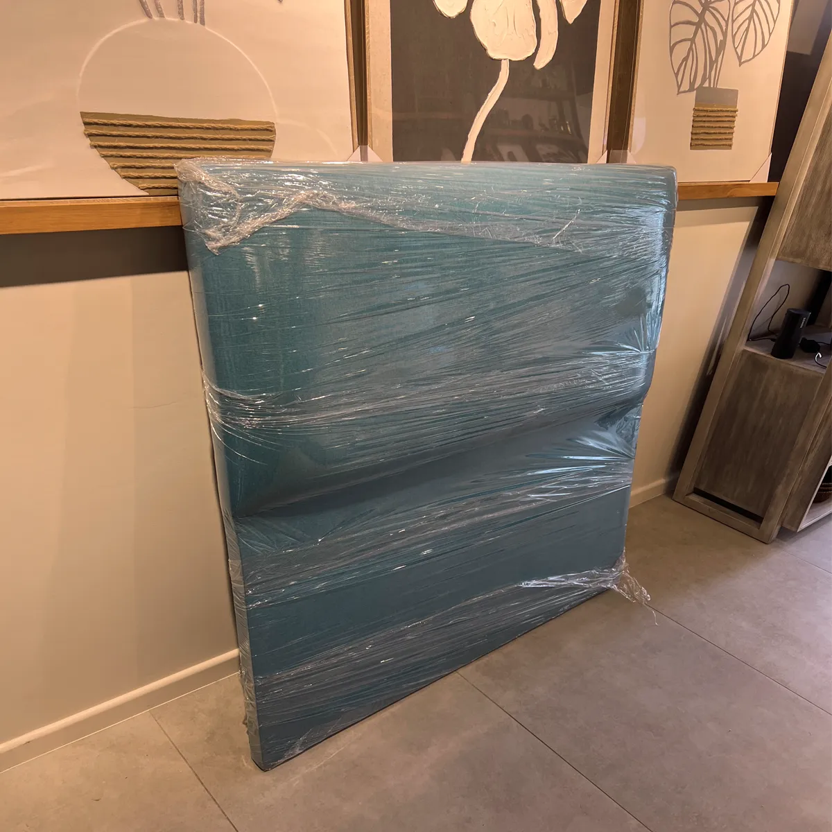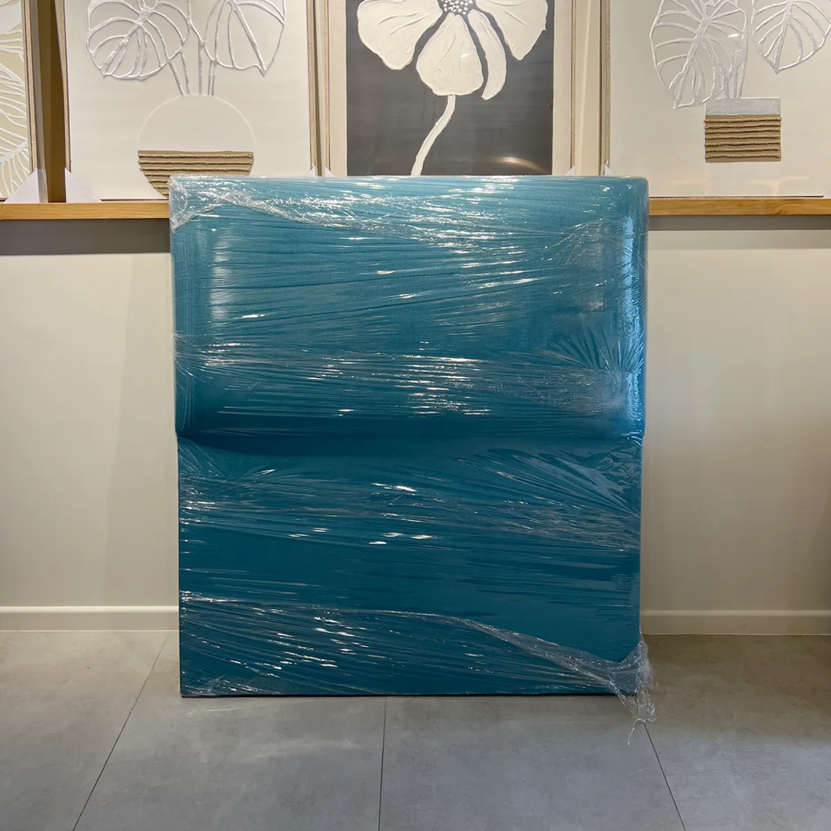 Hermoso Respaldo de Cama estilo Flat, ideal para darle vida a tu dormitorio y decorar tu hogar. Este tipo de mueble es fabricado directamente por Mobel Design, utilizando madera seca en cámara, espuma de alta densidad y tela de lino color turquesa.
