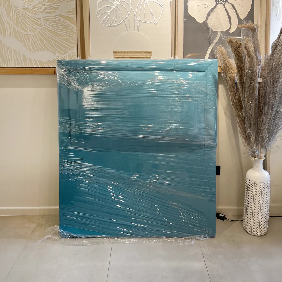 Hermoso Respaldo de Cama estilo Flat Frame Vivo, ideal para darle vida a tu dormitorio y decorar tu hogar. Este tipo de mueble es fabricado directamente por Mobel Design, utilizando madera seca en cámara, espuma de alta densidad y tela de lino color turquesa.