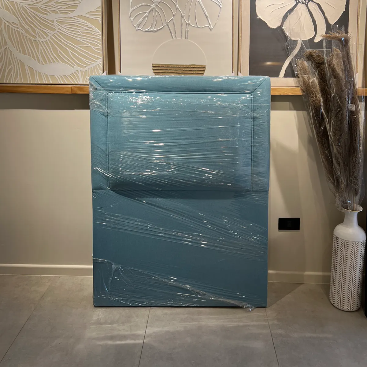 Hermoso Respaldo de Cama estilo Flat Frame Vivo, ideal para darle vida a tu dormitorio y decorar tu hogar. Este tipo de mueble es fabricado directamente por Mobel Design, utilizando madera seca en cámara, espuma de alta densidad y tela de lino color turquesa.