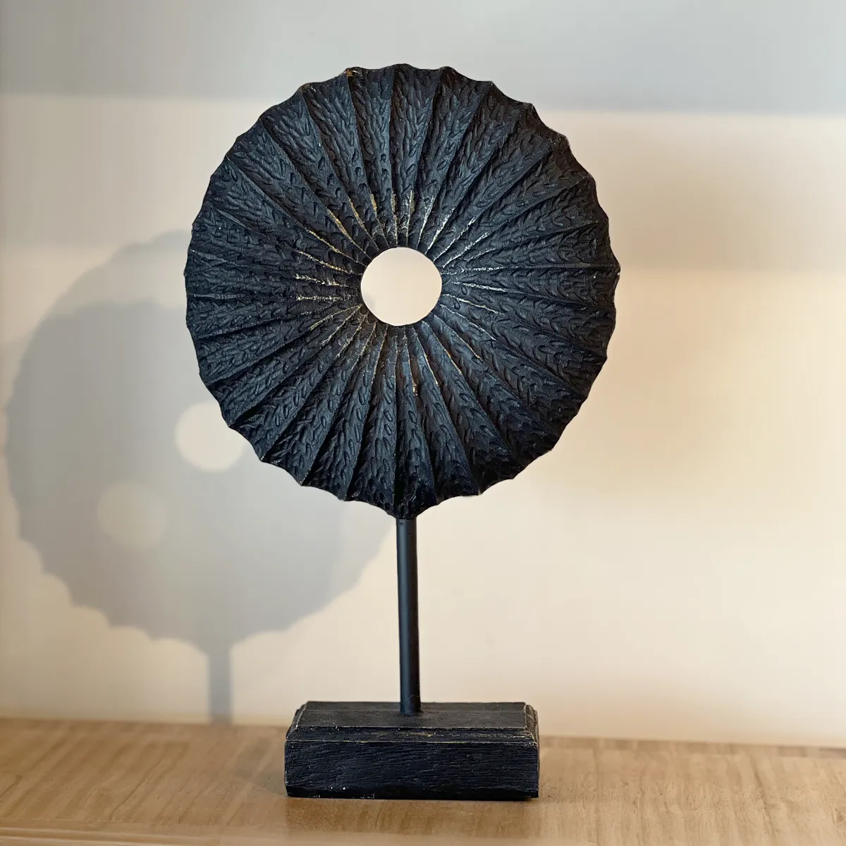 Este objeto decorativo escultórico destaca por su diseño circular en forma de sol con textura radial, inspirado en formas naturales y artesanales. Su acabado en tonos claros con sutiles matices blancos aporta luminosidad y sofisticación, mientras que la base y soporte en color oscuro crean un contraste moderno y equilibrado.