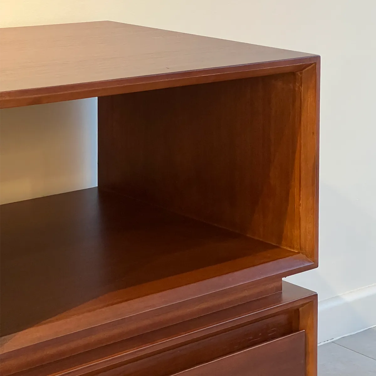 Cuenta con un amplio cajón inferior para mantener el orden y un nicho superior abierto perfecto para libros, lámparas o elementos decorativos.